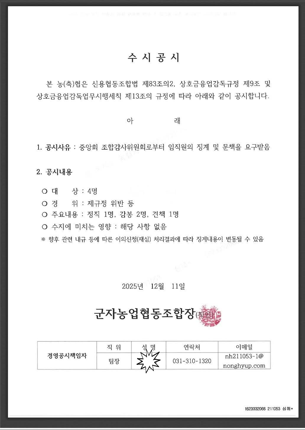 농협중앙회 조합감사위원회 감사 결과, 군자농협 소속 하나로마트 직원의 물품 무단 반출 사실이 드러나 정직 6개월의 징계가 내려졌고, 금융부문 직원들의 여신 관리 규정 위반에 대해서도 감봉·견책 등 징계 처분이 확정됐다.