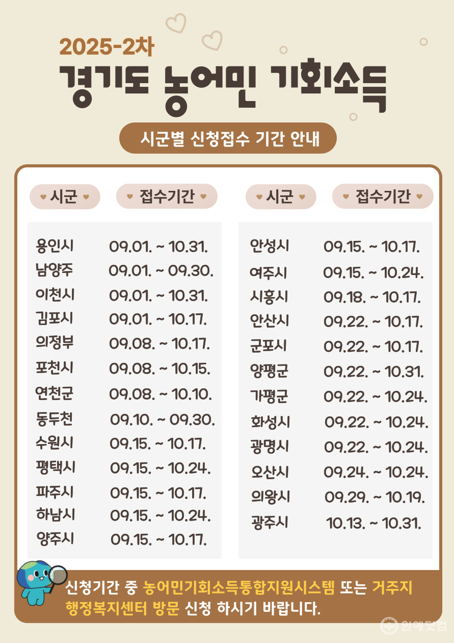 경기도가 농어민의 소득 안정을 위해 추진하는 ‘농어민 기회소득 지원사업’ 신청을 9월부터 본격적으로 받기 시작했다.
