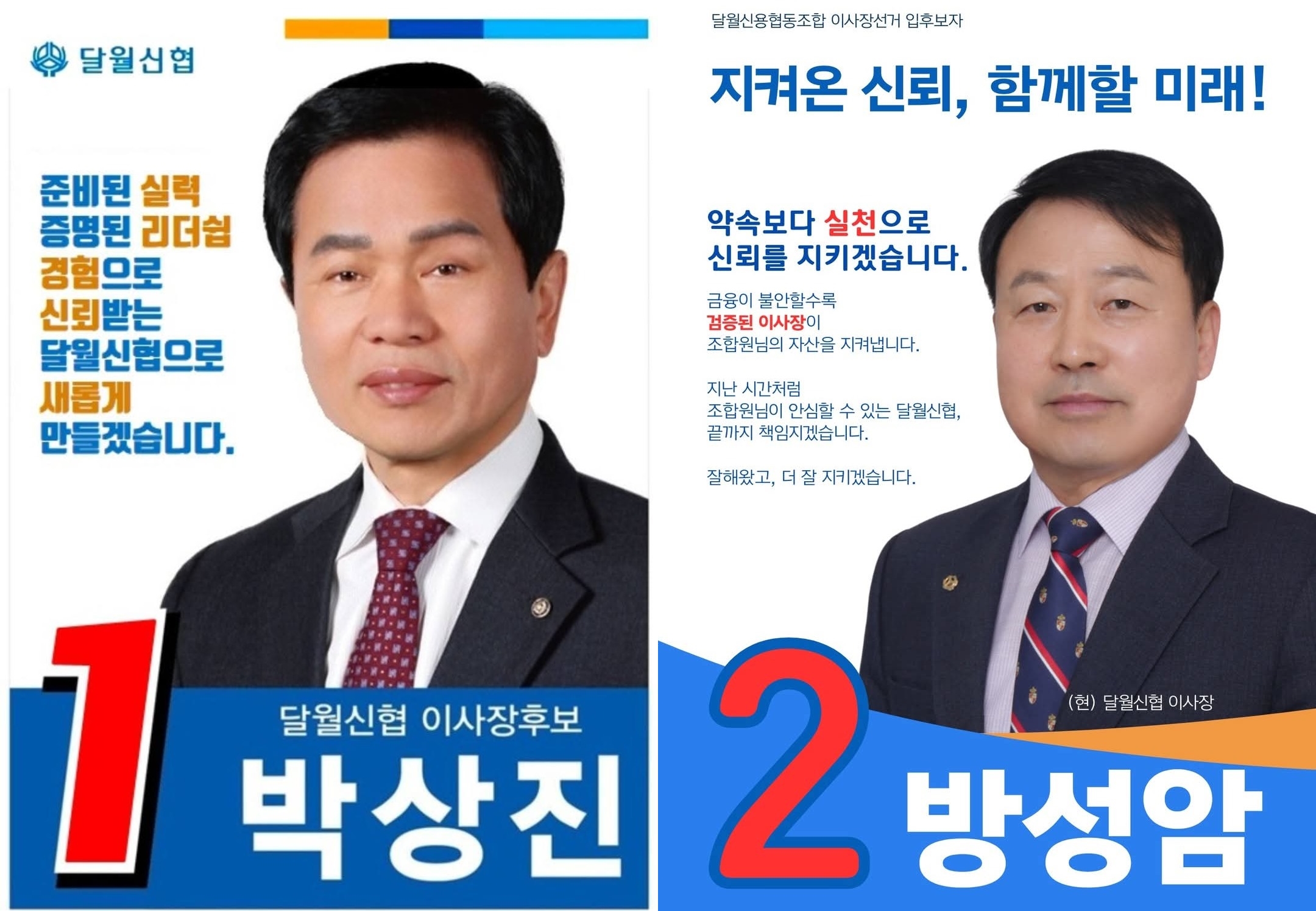 (사진설명) 사진은 달월신협 이사장 후보로 나선 기호1번 박상진 후보와 기호2번 방성암 후보의 선거 공보물이다.