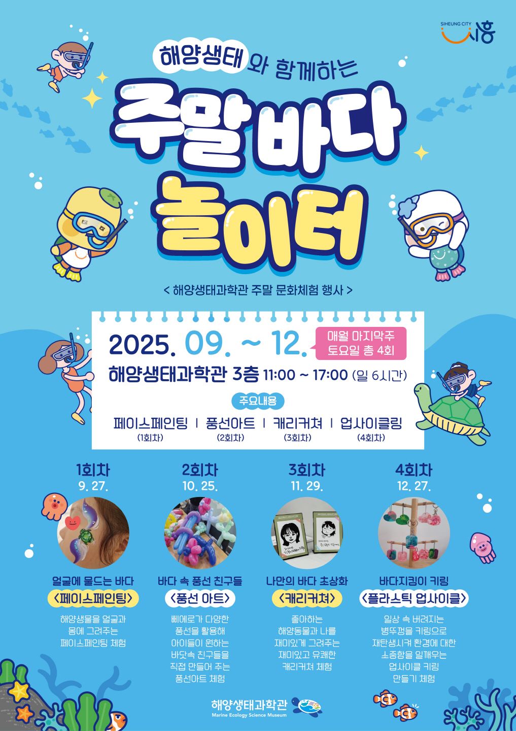 시흥시(시장 임병택)가 오는 12월까지 매월 마지막 주 토요일, 해양생태과학관 3층 기획전시실에서 가족과 함께 즐길 수 있는 특별한 주말 문화체험 프로그램을 선보인다.