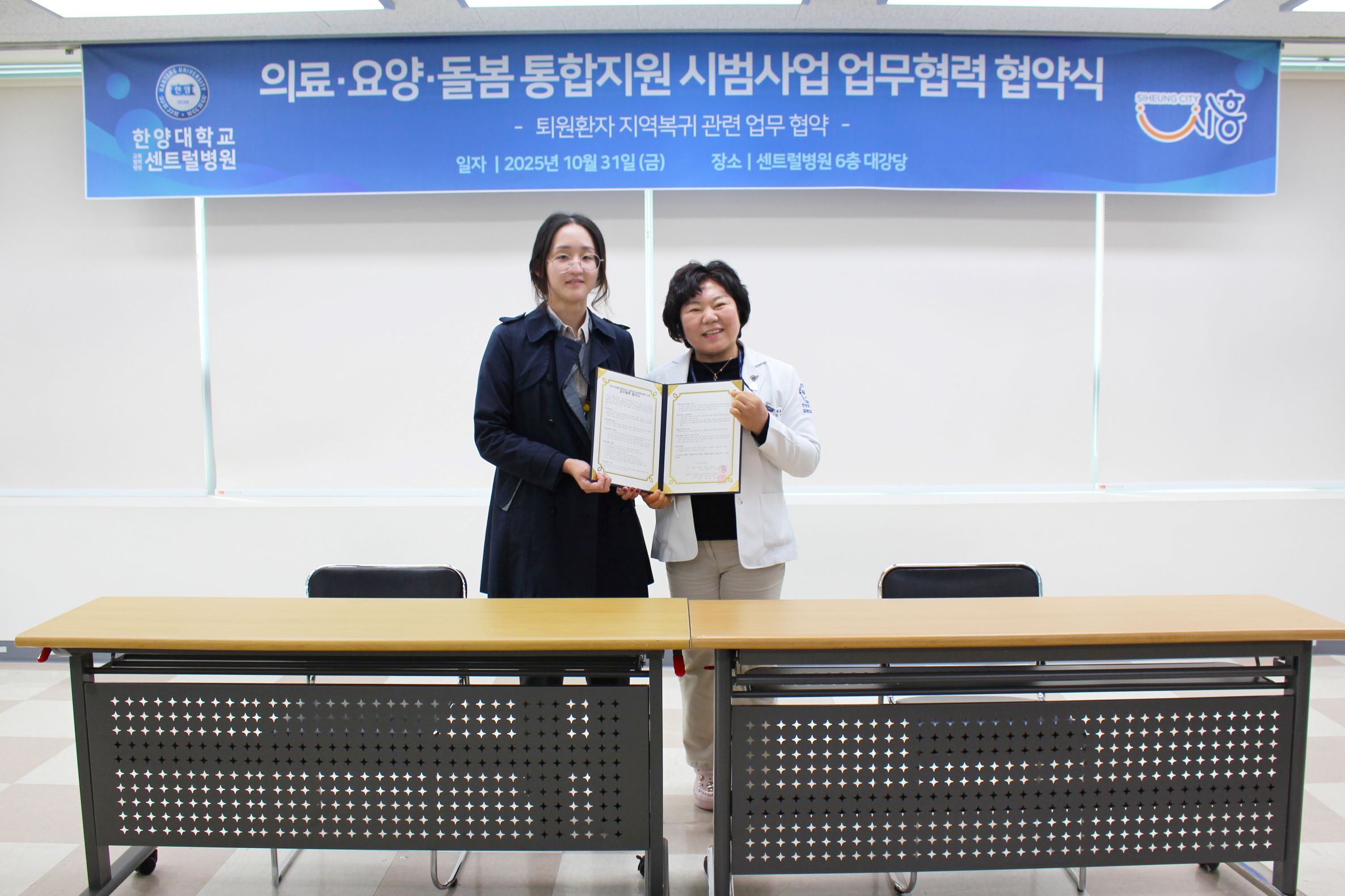 한양대학교 교육협력병원 센트럴병원(이사장 김병근)은 10월 31일 시흥시(시장 임병택)와 ‘퇴원환자 지역복귀 및 의료돌봄 협력체계 구축’을 위한 업무협약을 체결했다.
