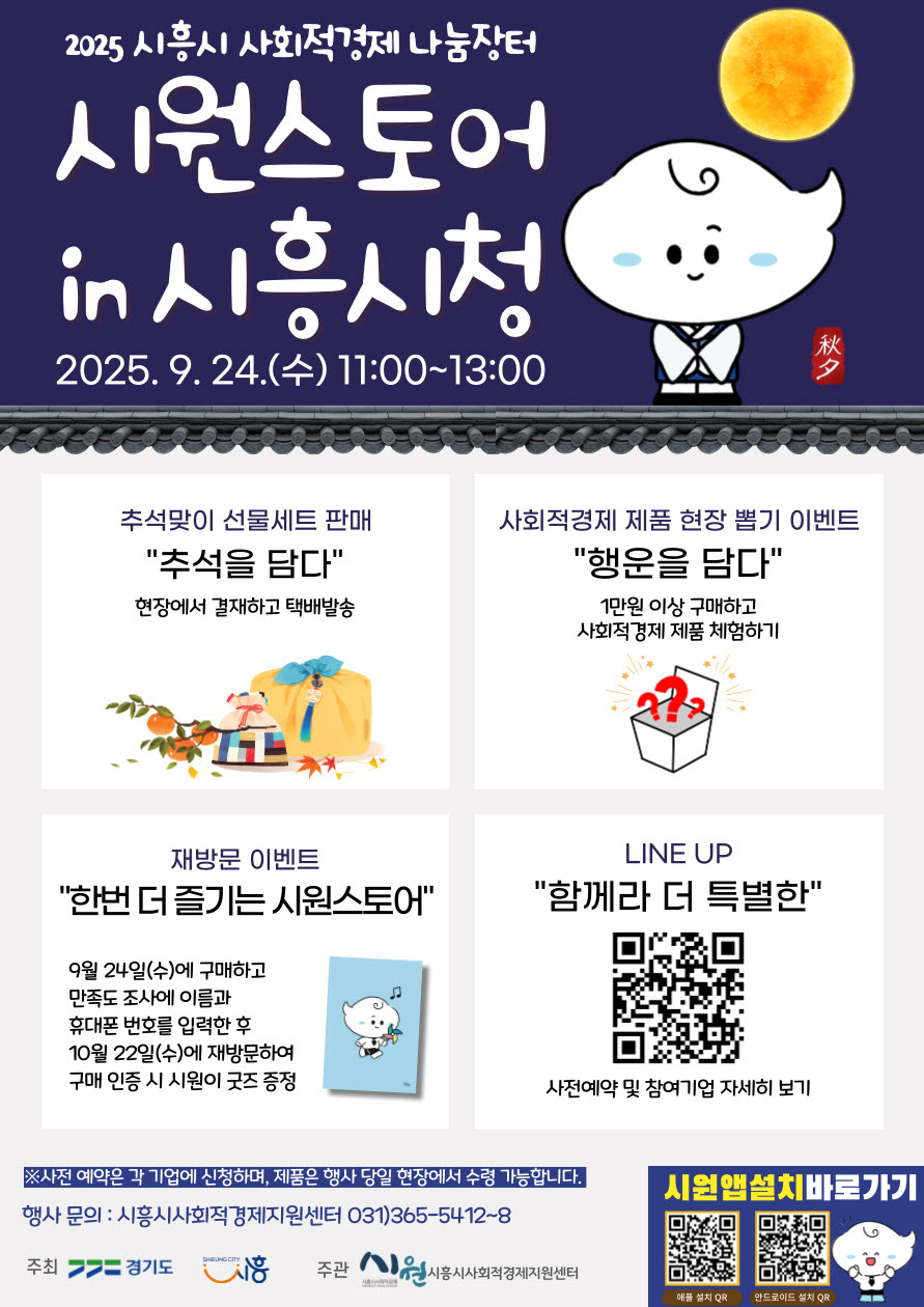 시흥시(시장 임병택)가 오는 9월 24일 오전 11시부터 오후 1시까지 시흥시청 지하 1층 로비에서 사회적경제 나눔장터 ‘시원스토어 in 시흥시청’을 연다.