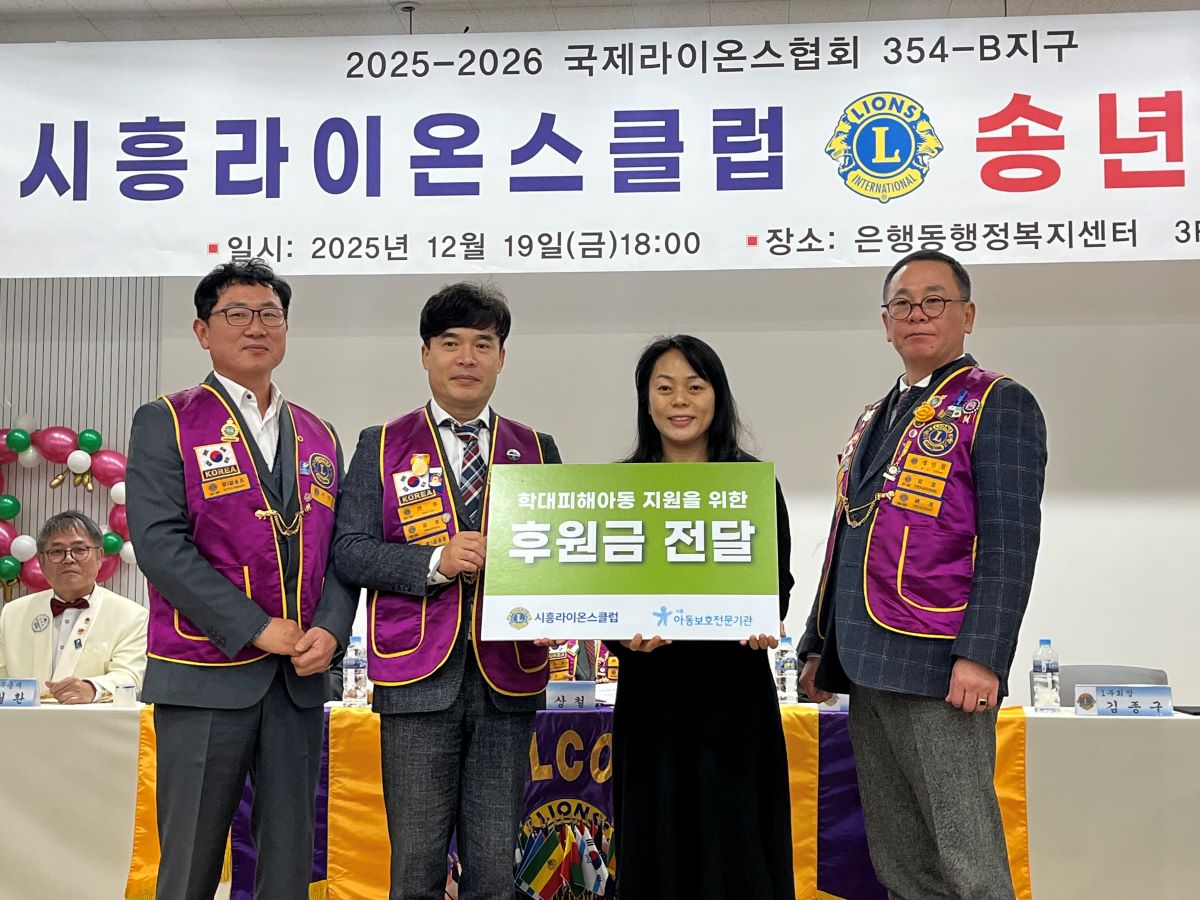 시흥아동보호전문기관은 지난 19일 은행동 행정복지센터에서 열린 시흥라이온스클럽 송년의 밤 행사에서 시흥라이온스클럽과 함께 학대피해아동 지원을 위한 후원금 전달식을 진행했다. 이번 전달식은 연말을 맞아 지역사회 나눔을 실천하고, 도움이 필요한 아동들에게 따뜻한 마음을 전하기 위해 마련됐다.