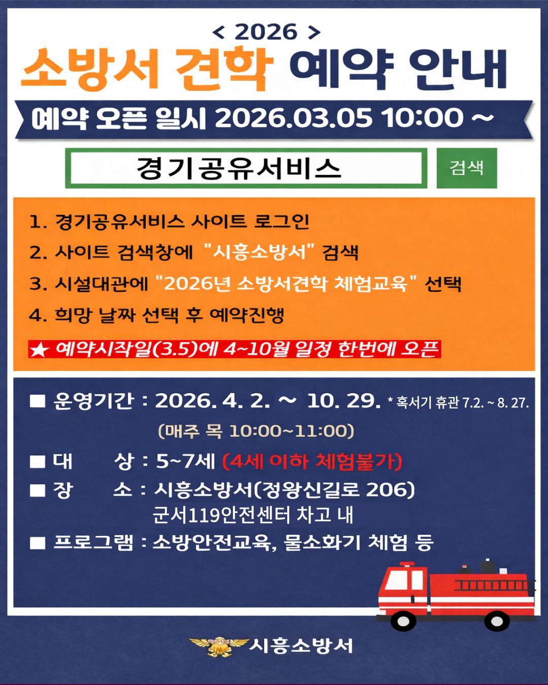 예약은 3월 5일 오전 10시부터 시작되며, 4월부터 10월까지의 전체 일정이 예약 시작일에 일괄 오픈된다. 신청은 ‘경기공유서비스’ 홈페이지에서 로그인 후 검색창에 ‘시흥소방서’를 입력하고 ‘2026년 소방서 견학 체험교육’을 선택해 희망 날짜를 지정하면 된다.