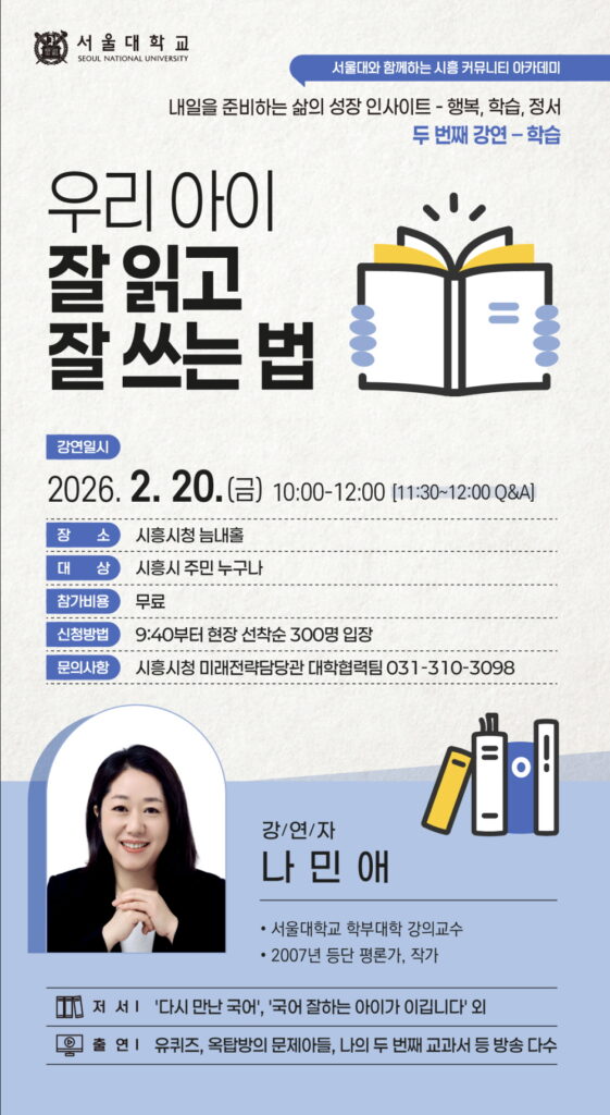 상반기에는 서울대학교 교수진이 참여하는 시민 대상 강연 프로그램 ‘시흥 커뮤니티 아카데미’를 1월부터 5월까지 월 1회씩 총 5회 운영한다. 강연은 서울대학교 시흥캠퍼스 컨벤션홀과 시청 늠내홀에서 진행되며, 시흥시민 누구나 참여할 수 있다. 오는 2월 20일 오전 10시에는 시청 늠내홀에서 나민애 서울대학교 교수의 강연 ‘우리 아이 잘 읽고 잘 쓰는 법’이 열린다.