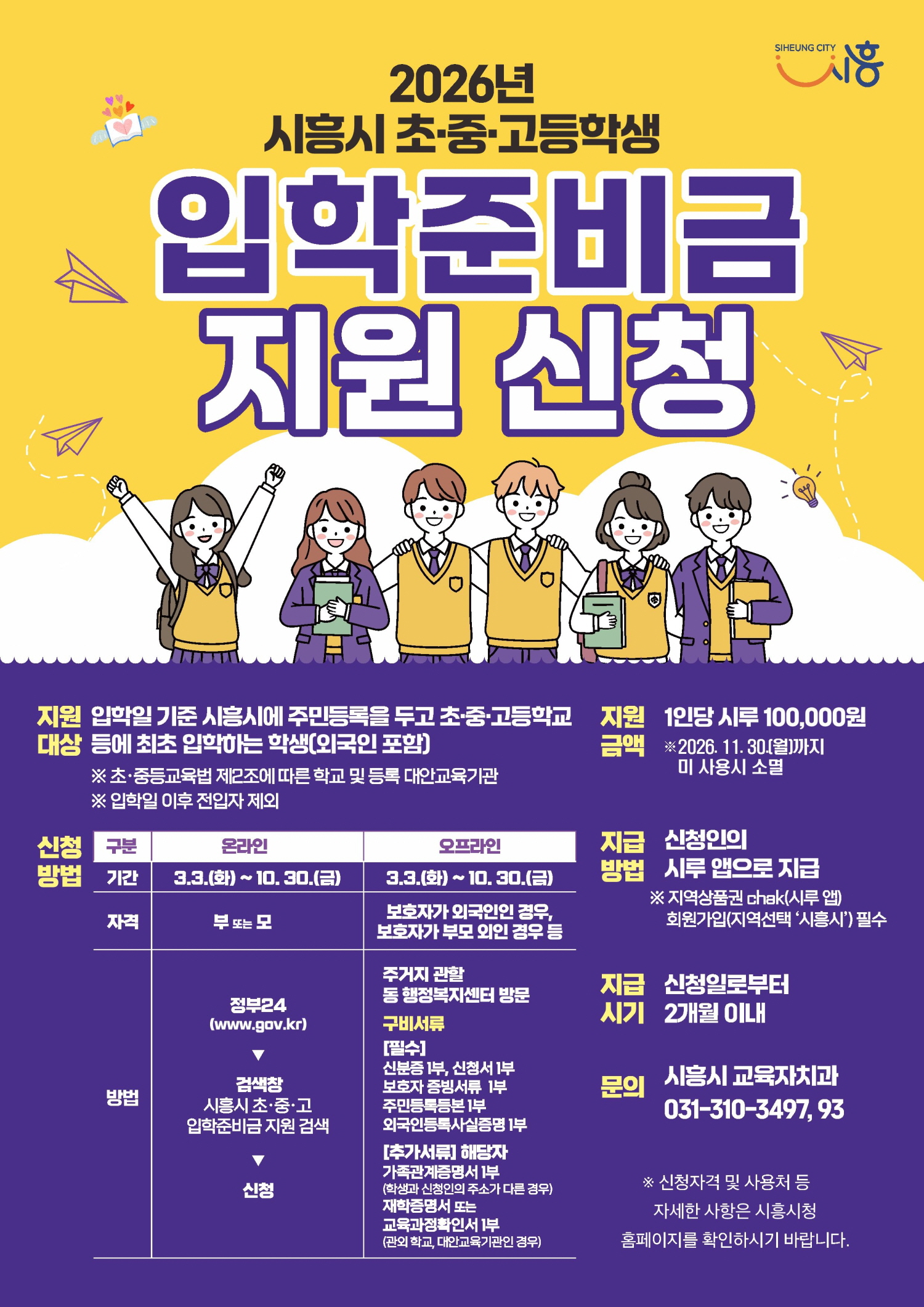 지원 대상은 입학일 기준인 3월 3일 현재 시흥시에 주민등록이 돼 있는 초·중·고 신입생 약 1만 6천여 명으로, 외국인 학생도 포함된다. 지원금은 시흥 지역화폐 모바일 ‘시루’로 1인당 10만 원씩 지급된다.