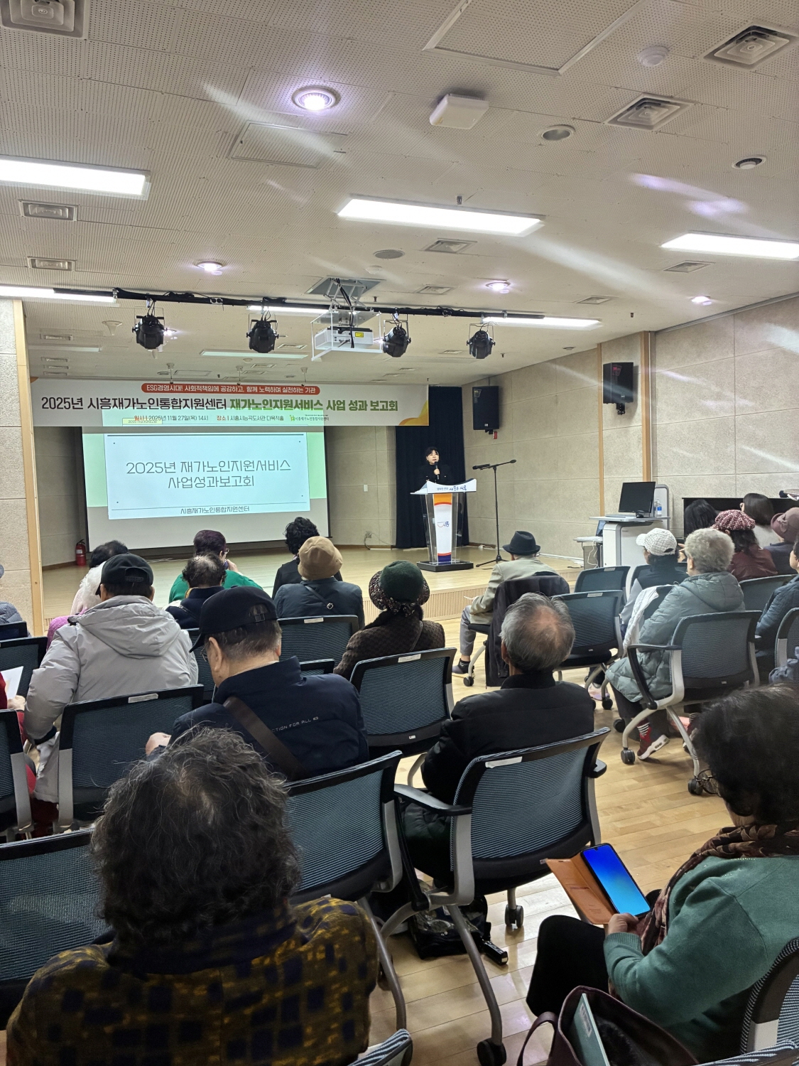 시흥시 재가노인지원서비스 수행기관인 시흥재가노인통합지원센터가 지난 11월 27일 능곡도서관에서 ‘2025년 재가노인지원서비스 사업성과보고회’를 열고 한 해의 추진 성과를 공유했다. 성과보고회에는 서비스 이용 어르신과 시청 관계자, 유관기관 관계자 등 70여 명이 참석했다.