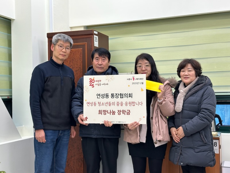 또한 연성동에서는 연성동 통장협의회가 지난 12월 26일 모범적인 학교생활을 이어가고 있는 중학생 3명에게 각각 20만 원씩 총 60만 원의 장학금을 전달했다. 통장협의회는 산불 피해 성금, 김장김치 나눔 등 지속적인 나눔 활동을 이어오고 있다. 강문원 회장은 “청소년들이 꿈을 잃지 않고 성장하길 바란다”고 말했으며, 김상동 연성동장은 “지역사회의 따뜻한 연대가 아이들의 미래를 밝히고 있다”고 전했다.
