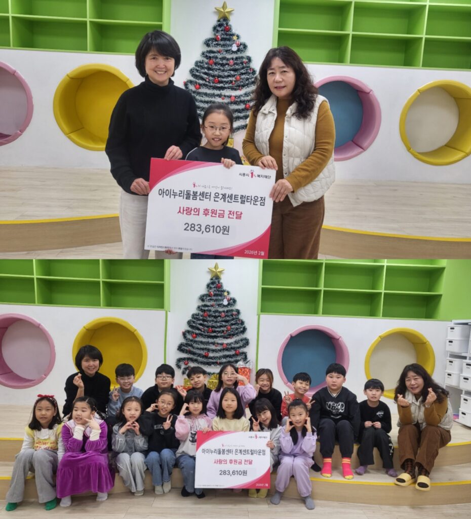 이어 지난 2월 4일에는 아이누리돌봄센터 은계센트럴타운점이 성장 축제 플리마켓 수익금 28만3,610원을 시흥시1%복지재단에 기부했다. 이번 후원금은 지난해 11월 아이들이 직접 기획하고 운영한 ‘오늘은 우리가’ 성장 축제의 일환으로 마련됐으며, 아이들이 사용하지 않는 물건을 교환·판매하는 플리마켓을 통해 조성됐다. 행사에는 지역 교회와 사회적협동조합, 지역아동센터 등 다양한 단체가 물품 후원으로 동참했다.