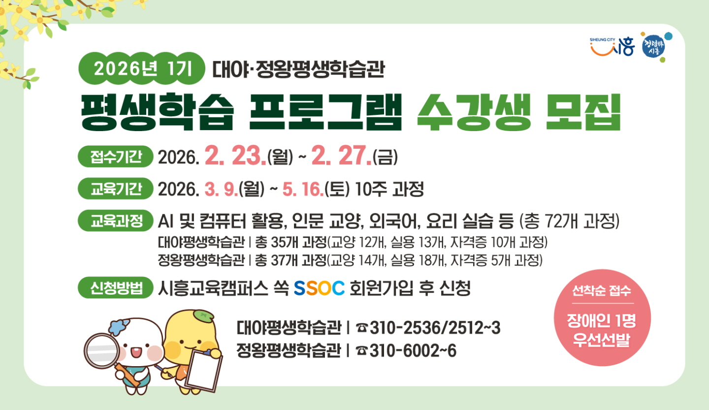 시흥시 대야·정왕평생학습관이 오는 2월 23일부터 27일까지 ‘2026년 1기 평생학습 프로그램’ 수강생을 모집한다. 프로그램은 3월 9일부터 5월 16일까지 10주간 운영된다.